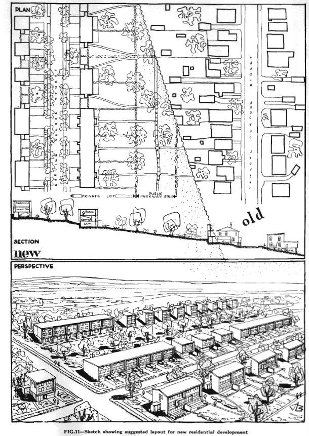 On Residential Zones, The report suggests separation within residential zones, so that Single Family Homes, Duplexes, and Apartments are kept separate from each other. New developments should be planned as whole communities, and be provided with social, recreational and other facilities as par to fo the plan. The plan for the North Slope is a good example of this methodology. The Report recommends leaving Residential districts alone for the most part, except in 2 areas. These 2 areas, the report states “by reason of blight and obsolescence, should be re-planned and redeveloped”